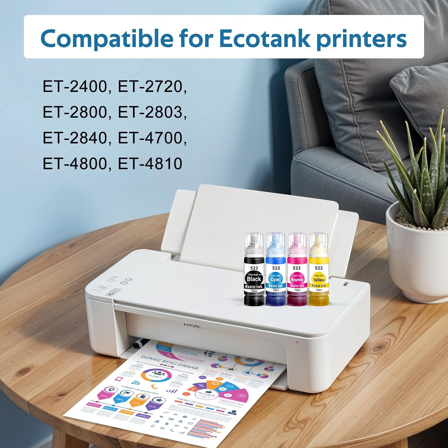 • Compatibility Options : Compatible for Epson 522 Ink Works with EcoTank ET-2400, ET-2720, ET-2800, ET-2803, ET-2840, ET-4700, ET-4800, ET-4810 Printer Compatible for Epson 522 Ink Works with EcoTank ET-2400, ET-2720, ET-2800, ET-2803, ET-2840, ET-4700, ET-4800, ET-4810 Printer