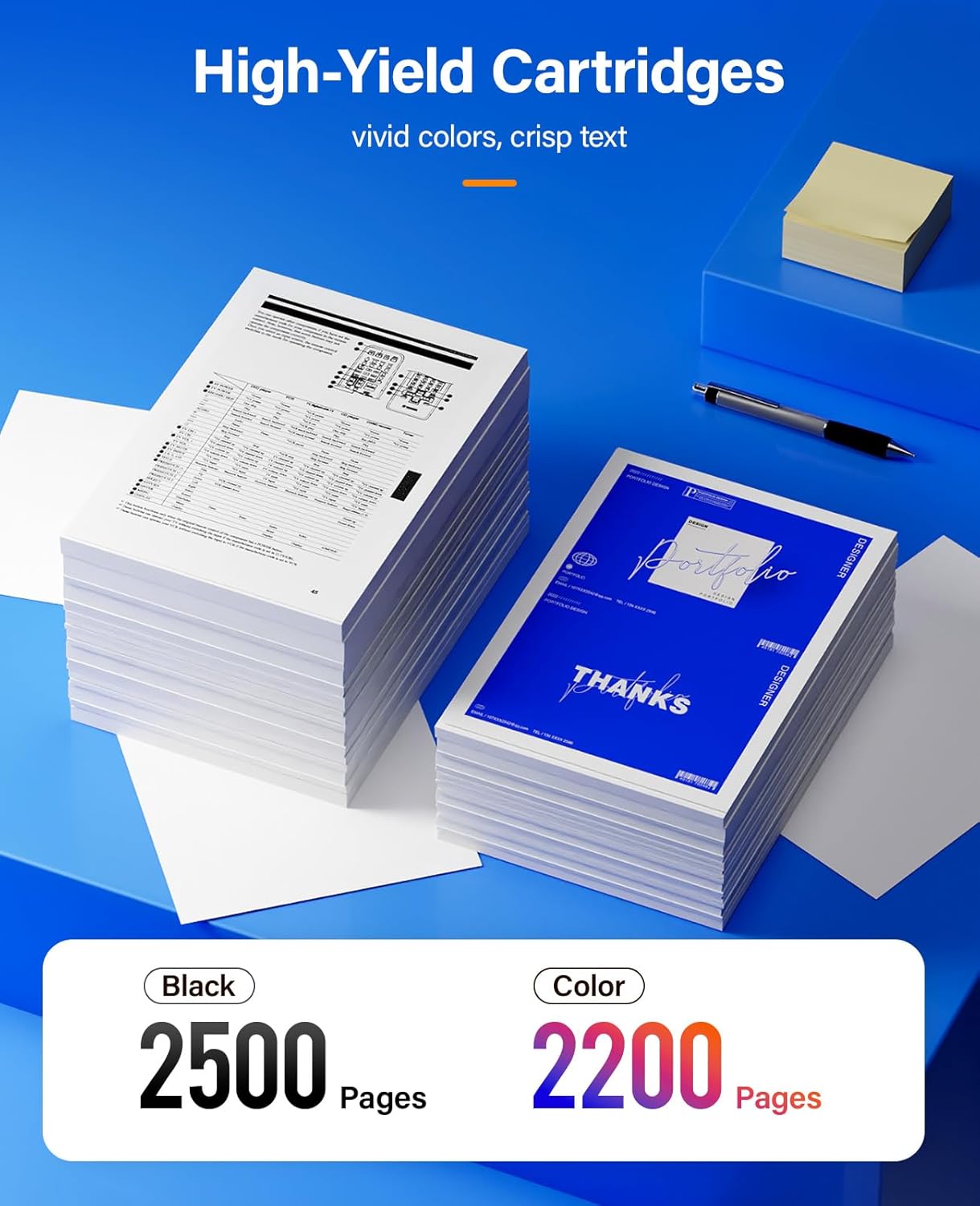 • Page Yield: Up to Black is 2,500 pages per black cartridge and Color is 2,200 Pages per color cartridge (Letter/A4, at 5% Coverage).