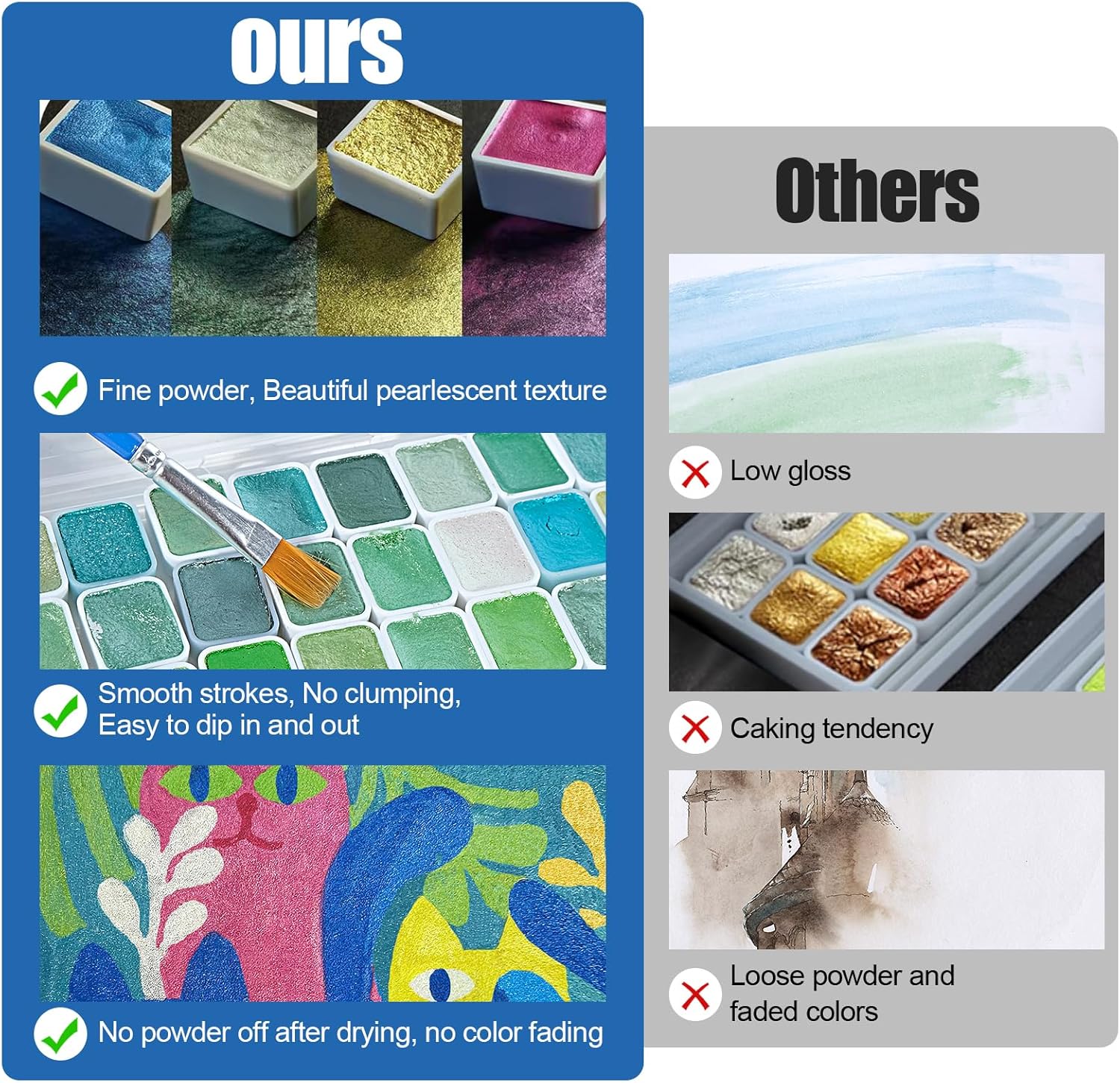 • 【Smooth Strokes, No Powder Off】Our watercolors paint set are extremely durability. Glitter watercolor remain highly stable, drying without crumbling or fading, making the watercolor painting shine forever. The fine powder texture makes the strokes of the pearl paint smooth and resists clumping