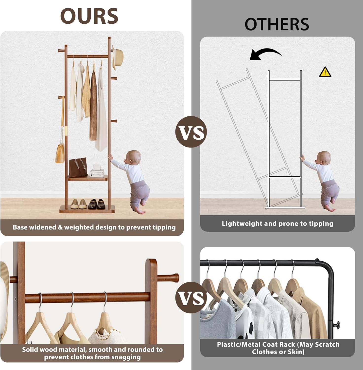 • 【Solid Wood & Heavy Duty Construction】 Made of 100% solid wood with double-layer shelves, this coat rack ensures superior stability and long-lasting durability. The reinforced structure supports heavy coats, bags, and accessories without wobbling