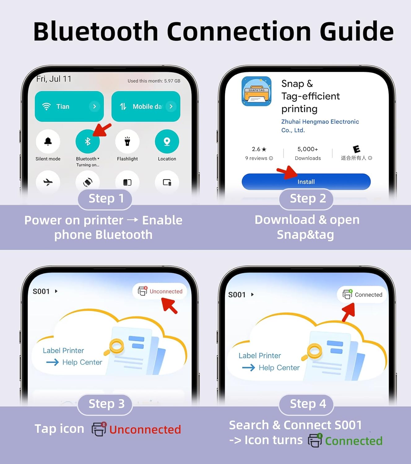 • Multiple Creative Functions: The Snap & Tag app for this Bluetooth label maker provides various features and templates, easily create label stickers with text, QR codes, barcodes, materials, images, time, and borders; Customize label lengths with continuous tape, or use fixed-size labels for batch printing, featuring a built-in cutter for simple label cutting