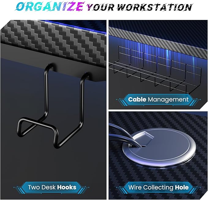 • Organize Your Workstation : 55"x24" eco-friendly desktop provides you with a spacious workspace. Integrated cable management tray and hooks for headphones or bags, ensuring a tidy workspace. Say goodbye to cable chaos and focus on what matters!