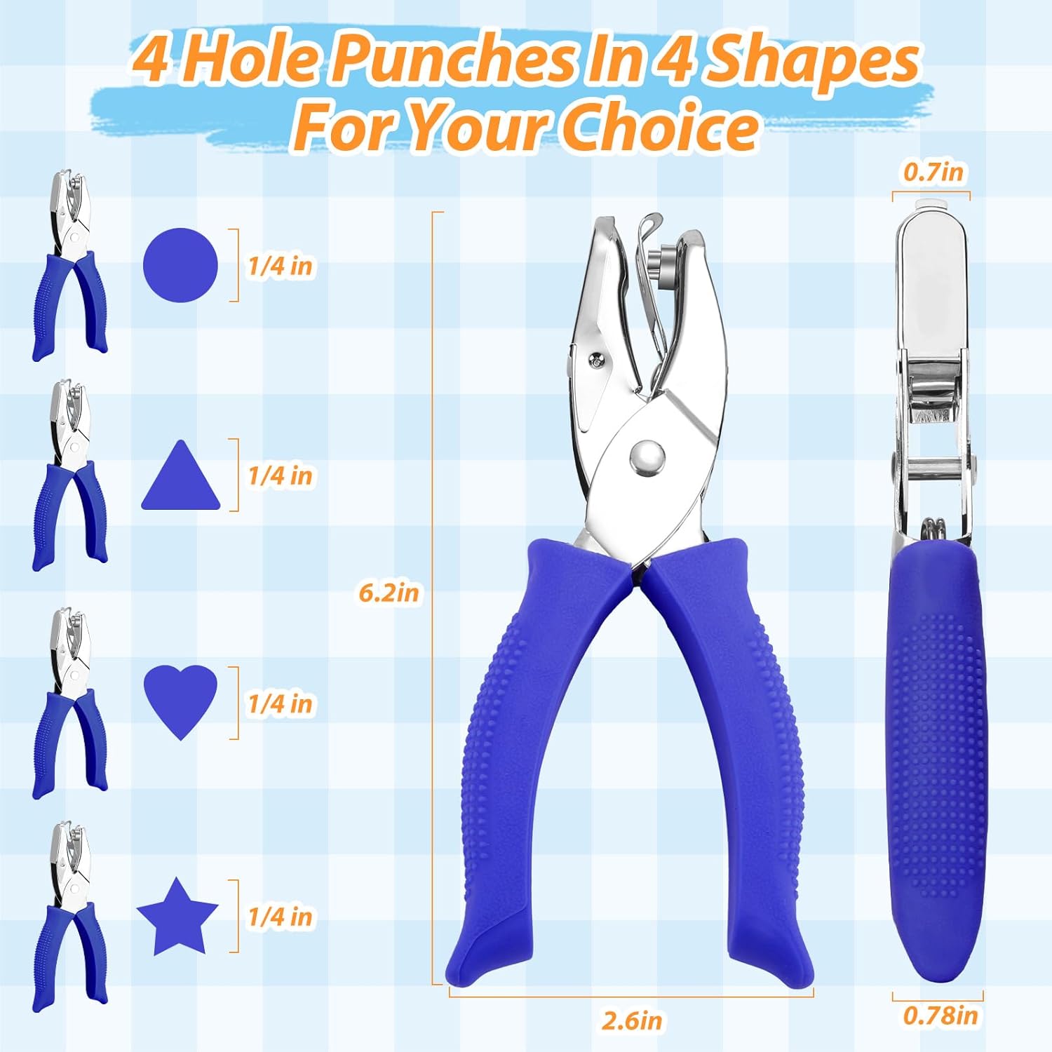 4 Packs Shape Hole Punch Set - 1/4" Circle, Heart, Star, Triangle Puncher with Soft Grip for Binder, Scrapbooking, Cards | Paper Craft Tools with Storage Slot & Reinforcement Stickers (Blue)
