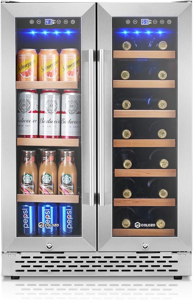 • 【Dual Zone Precision Temp Control】COLOZO 24" Dual Zone Wine Beverage Refrigerator uses advanced cooling technology to achieve a precise temperature storage environment. (Left zone: 35-50°F Right zone; Left zone: 41- 64°F. )The dual-zone design gives you the flexibility to store wine and chill beverages in optimal conditions. Its spacious capacity can accommodate up to 20 bottles of 750ml standard Bordeaux wine and 88 12oz standard cans of wine, giving you plenty of space to collect a variety of wines