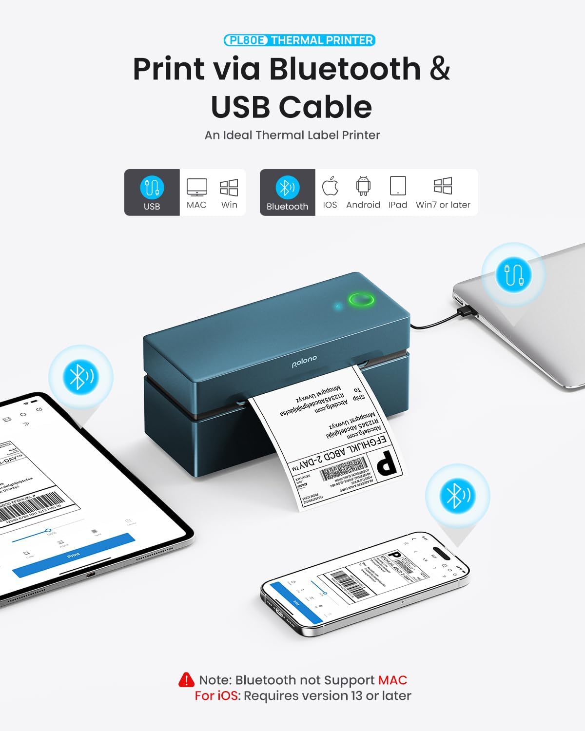 • Printing via Bluetooth: The thermal printer supports Bluetooth printing via the "Labelnize" app. Download the app from Google Play or Apple App Store for Android and iOS 13 or above. For Windows 7+, connect the shipping label printer via Bluetooth, please successfully install the driver via USB before using the Bluetooth connection. Always connect the thermal printer through the app; do not connect the shipping label printer directly via Bluetooth. Note: MAC OS does not support Bluetooth connection for the thermal printer