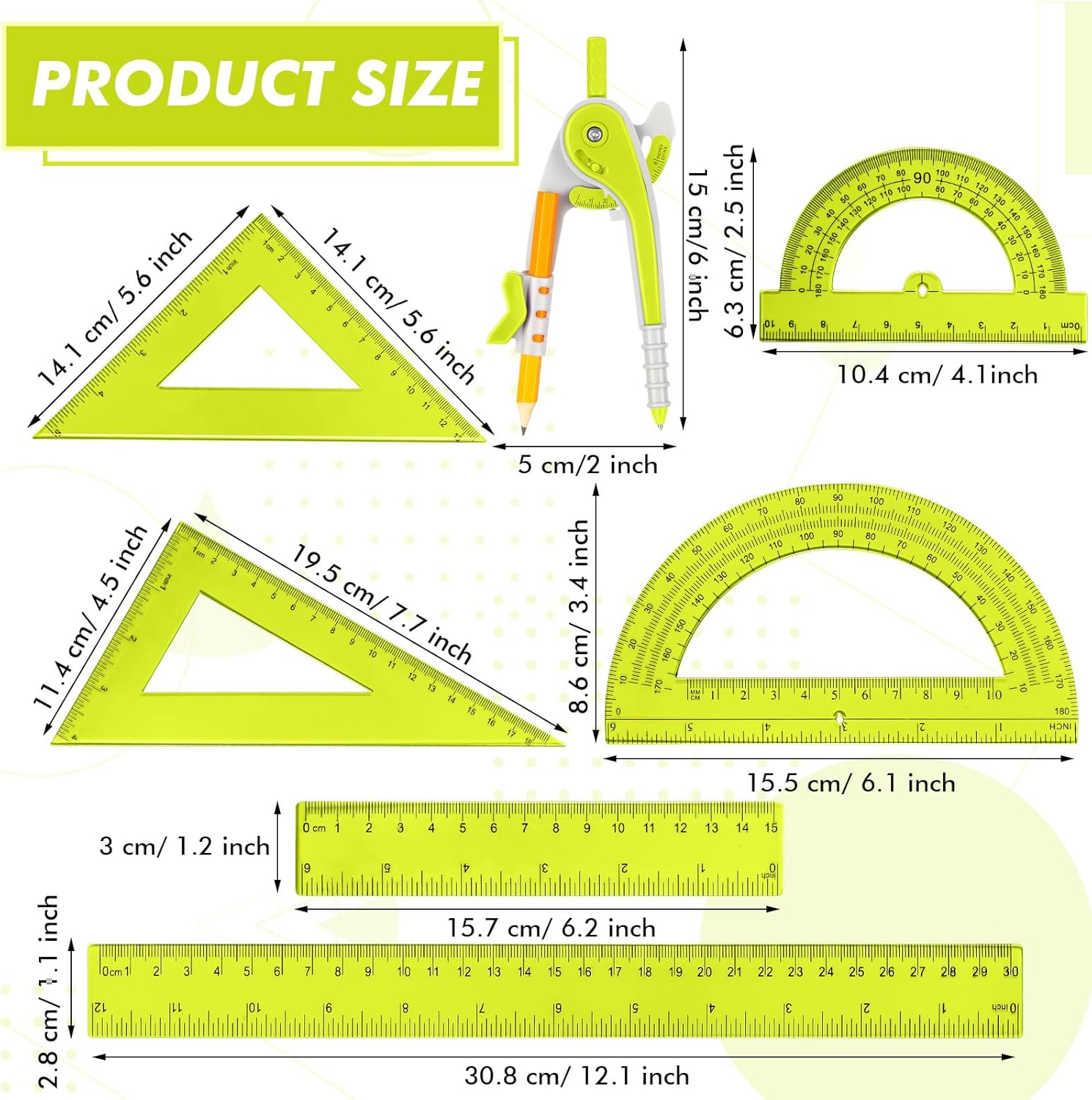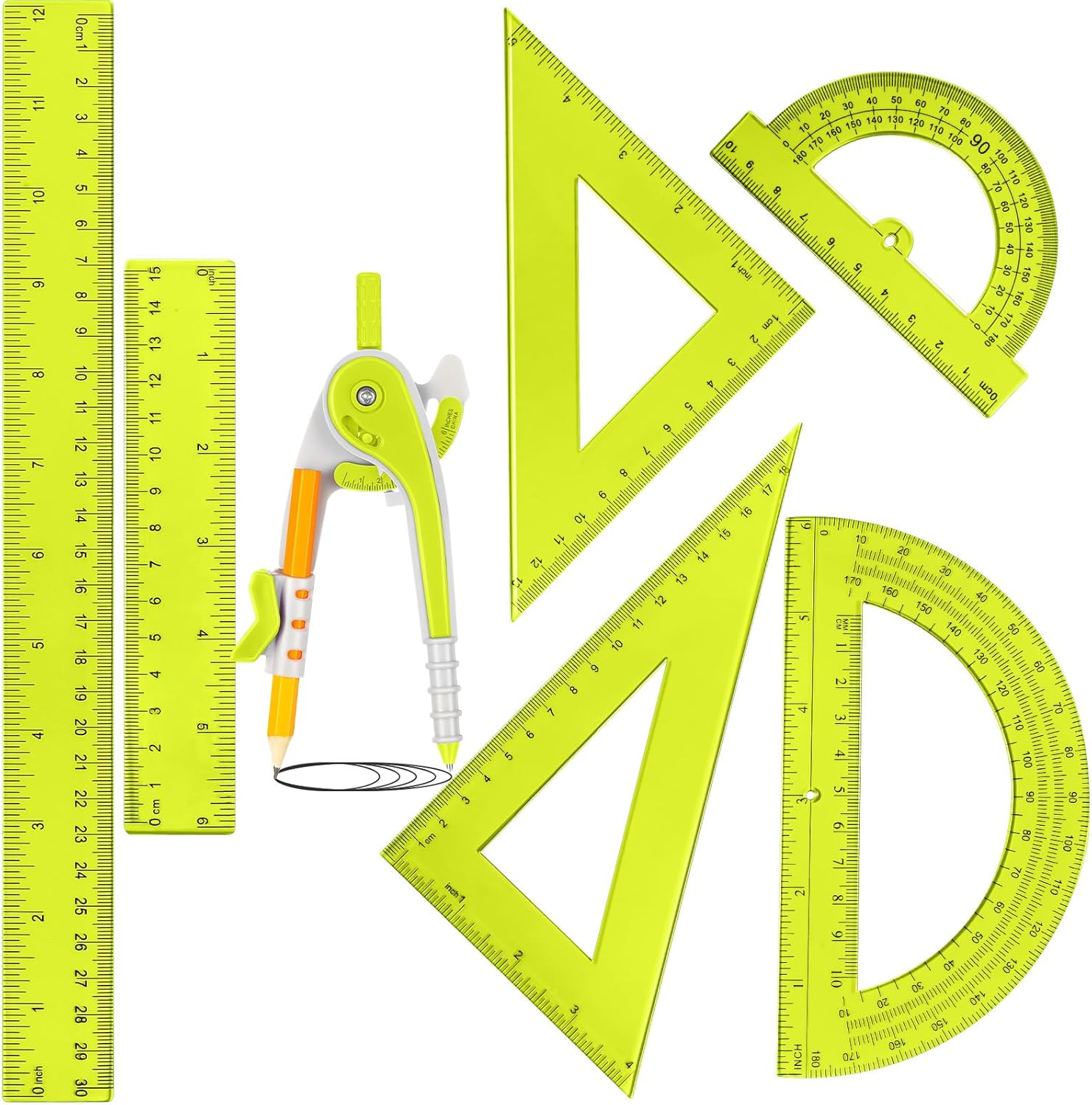 • Geometry Tool Set for Professionals Students: includes 2 pcs plastic ruler (11.81'' / 30 cm, 5.91'' / 15 cm), 2 pcs hollow protractor (6'' / 15.24 cm, 4'' / 10.16 cm), 1 pcs bevel triangle, 1 pcs isosceles triangle and 1 pcs plastic compass with pencil, this comprehensive set meets all drafting, measuring, and drawing needs