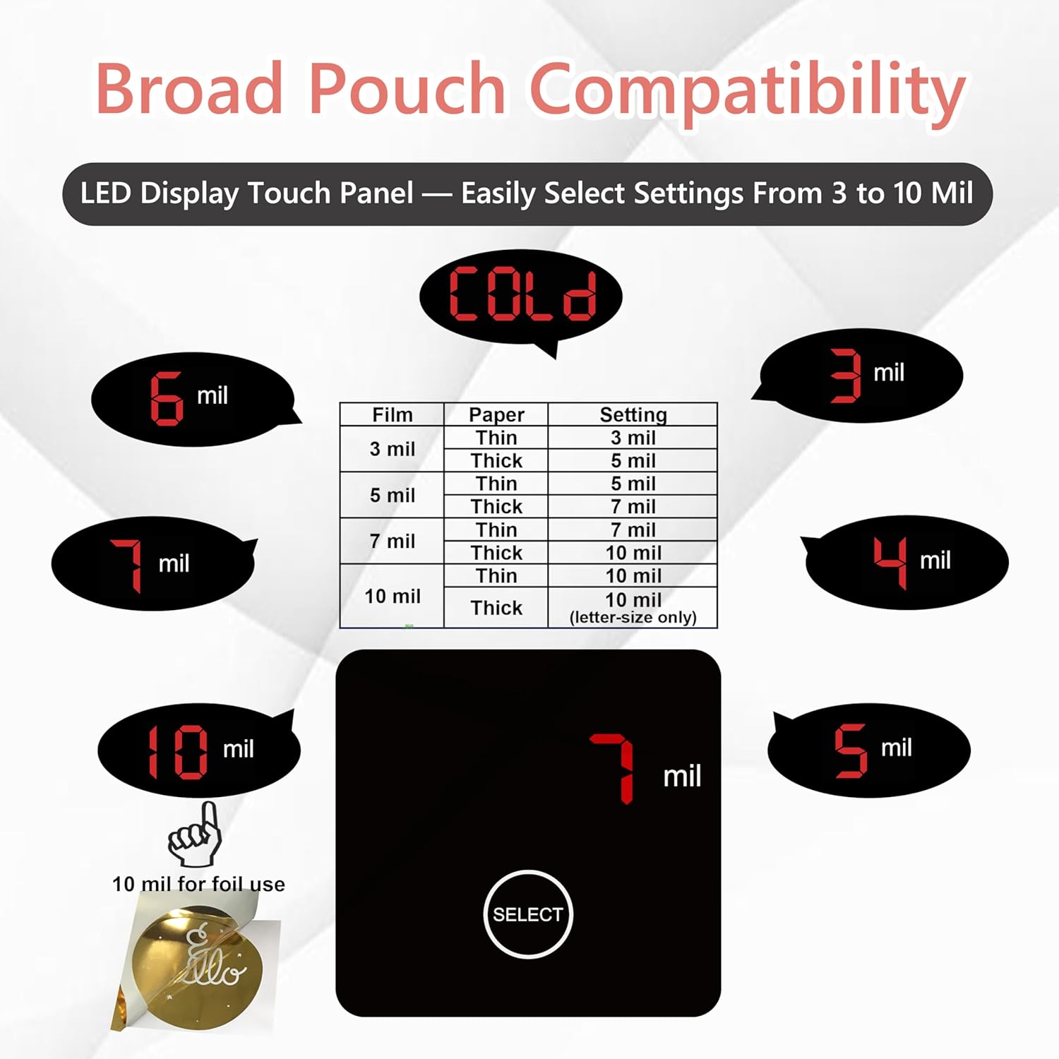 • 【LED Display Touch Panel】Easily select the appropriate setting based on pouch thickness with a simple, beginner-friendly one-touch control. Setting recommendations according to sheet and paper thickness are clearly printed on the machine for quick reference and ease of use.
