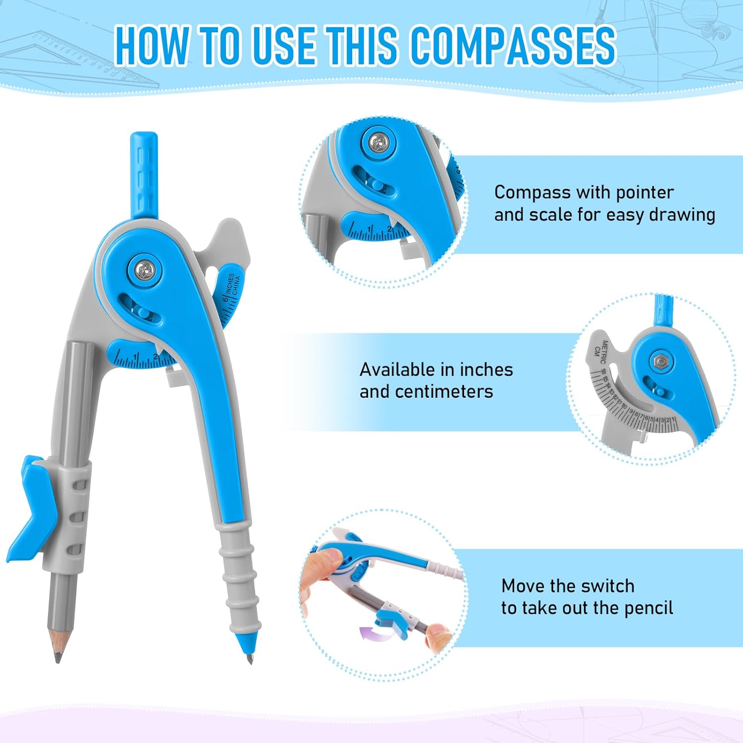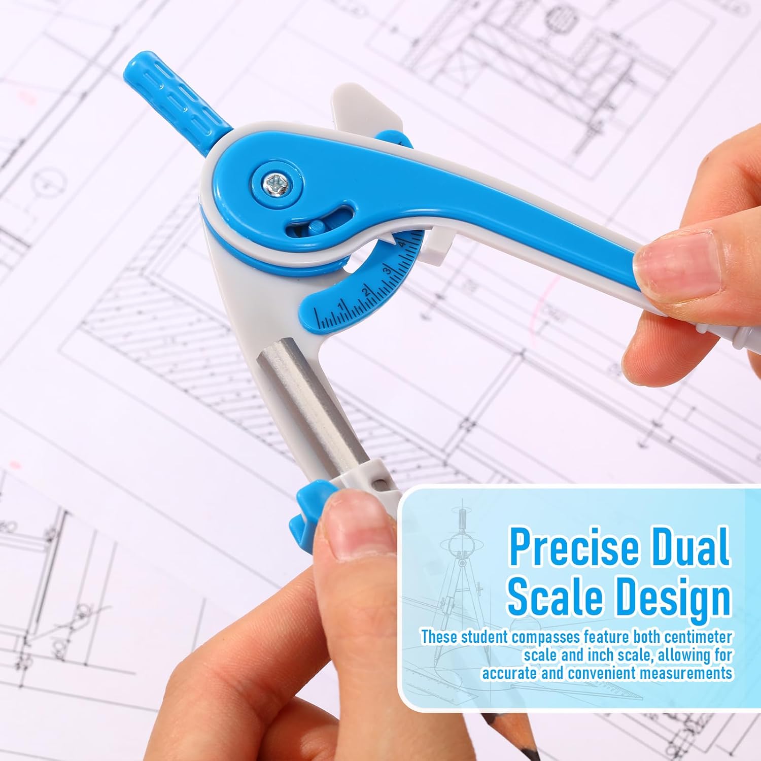 • 2 Diverse tips design compass: compass is made of plastic, sturdy mechanism can hold a radius well; The opposite side of the pencil end is an adjustable separated jaw, which allows you to fix the pencil