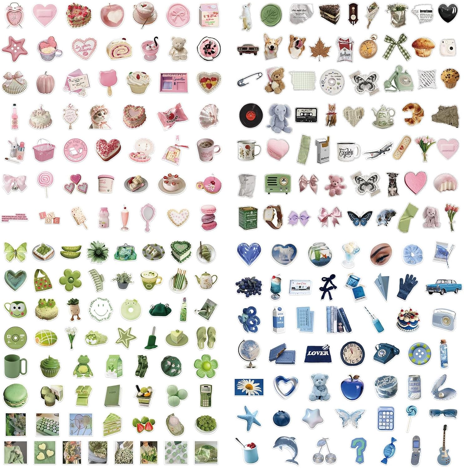 • Various Designs: Our scrapbook stickers set have 4 themes,pink theme, blue and green theme, Mixed colors theme and pink theme. We add many design elements according to these 4 colors such as Bears, hearts, cakes, dolls, butterflies, kittens, coffee, bouquets, alarm clocks, etc., rich in variety and diverse in style, fully satisfying your decoration and sharing needs.