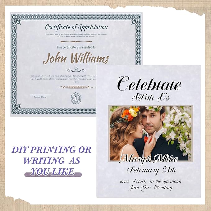 • Work As Different Things: these plain certificate papers are flexible in use, you can use them as certificate printing, wedding invitation, birthday invitation, restaurant menu, theme party decoration and so on, running smoothly in laser and inkjet printers, copiers and offset applications without jams