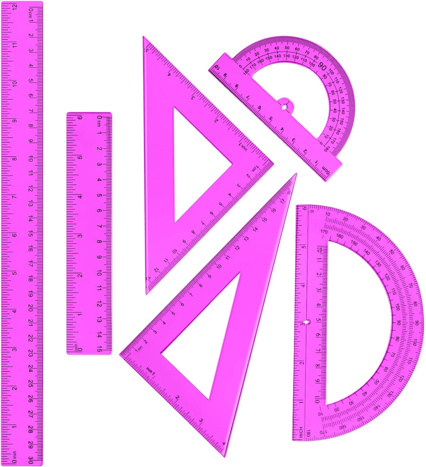 • Complete math tool set: you will be provided with 2 protractors of 15.5 cm and 10.4 cm, 2 triangle rulers of 45 degree and 60 degree, 2 straight rulers of 6 inch/ 15 cm and 12 inch/ 31 cm, totally 6 pieces; The complete combination meets the needs of various occasions, you can choose the right ruler to work according to your needs