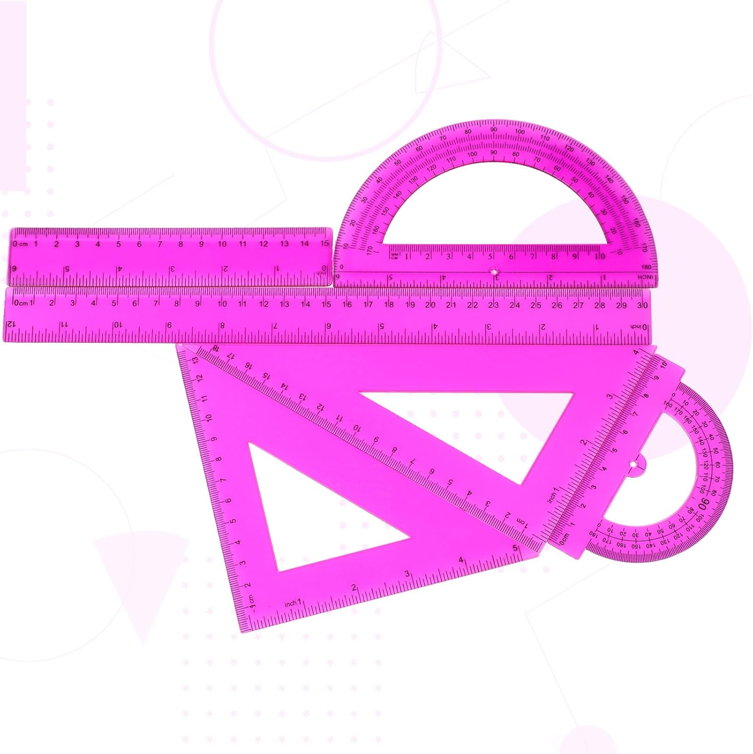 • Accurate scale: both sides of the protractor can measure 0-180 degrees, and the scale is accurate to 1 degree, helping you to quickly measure the value; Triangle and ruler have inches and centimeters on both sides, so you can use them to measure, draw geometric figures, parabola, etc., providing you with large convenience