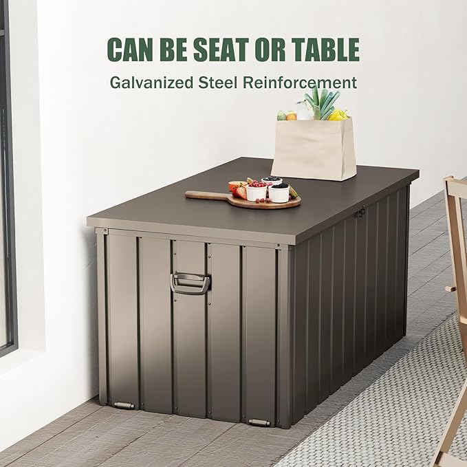 Domi Deck Box 160 Gallon, Waterproof Lockable Steel Outdoor Storage Container for Outside Cushions, Garden Tools and Pools Equipment, Brown