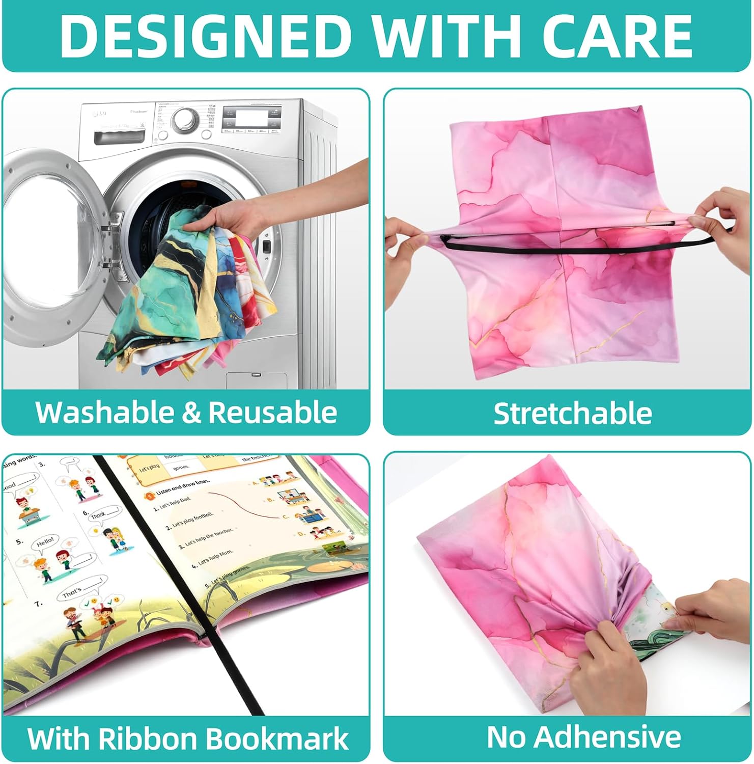 • Jumbo Stretchable Book Covers – Elastic fabric fits books up to 9 x 11 in. Washable and reusable—great for school and everyday use.