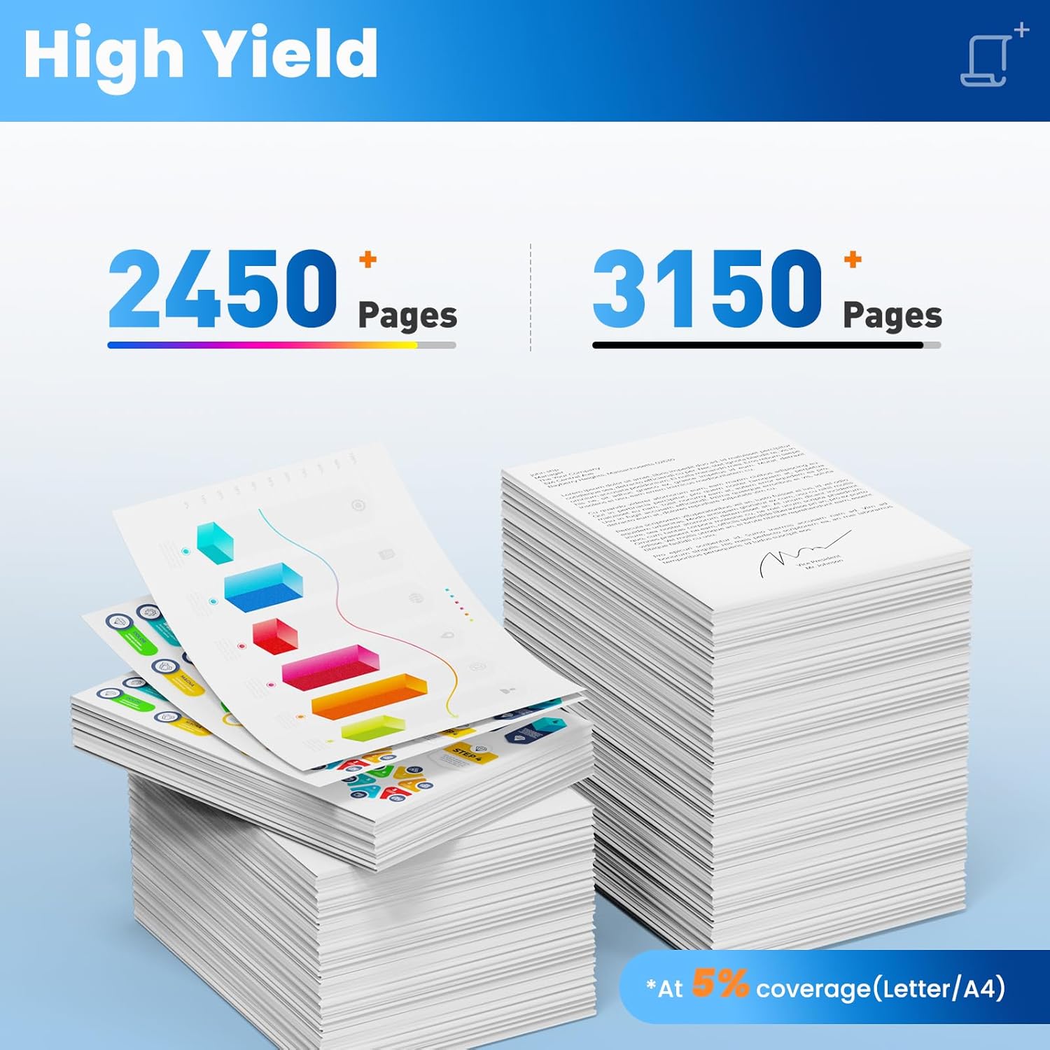 • 206X Toner Cartridges High Page Yield: High yield up to 3150 pages for 206X black toner cartridge and 2450 pages for 206x Cyan/Magenta/Yellow toner cartridge 5% coverage Letter/A4. Print documents or charts clearly and suitable for standard office/home printing.
