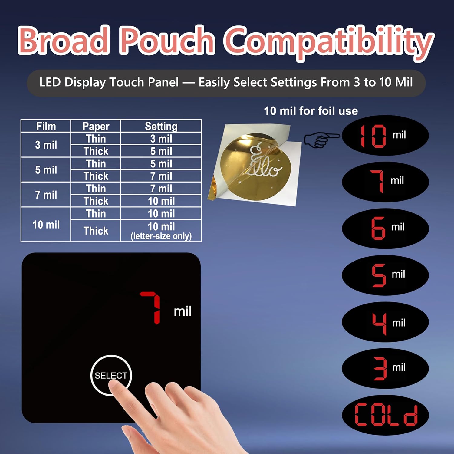 • 【LED Display Touch Panel】Easily select the appropriate setting based on pouch thickness with a simple, beginner-friendly one-touch control. Setting recommendations according to sheet and paper thickness are clearly printed on the machine for quick reference and ease of use.
