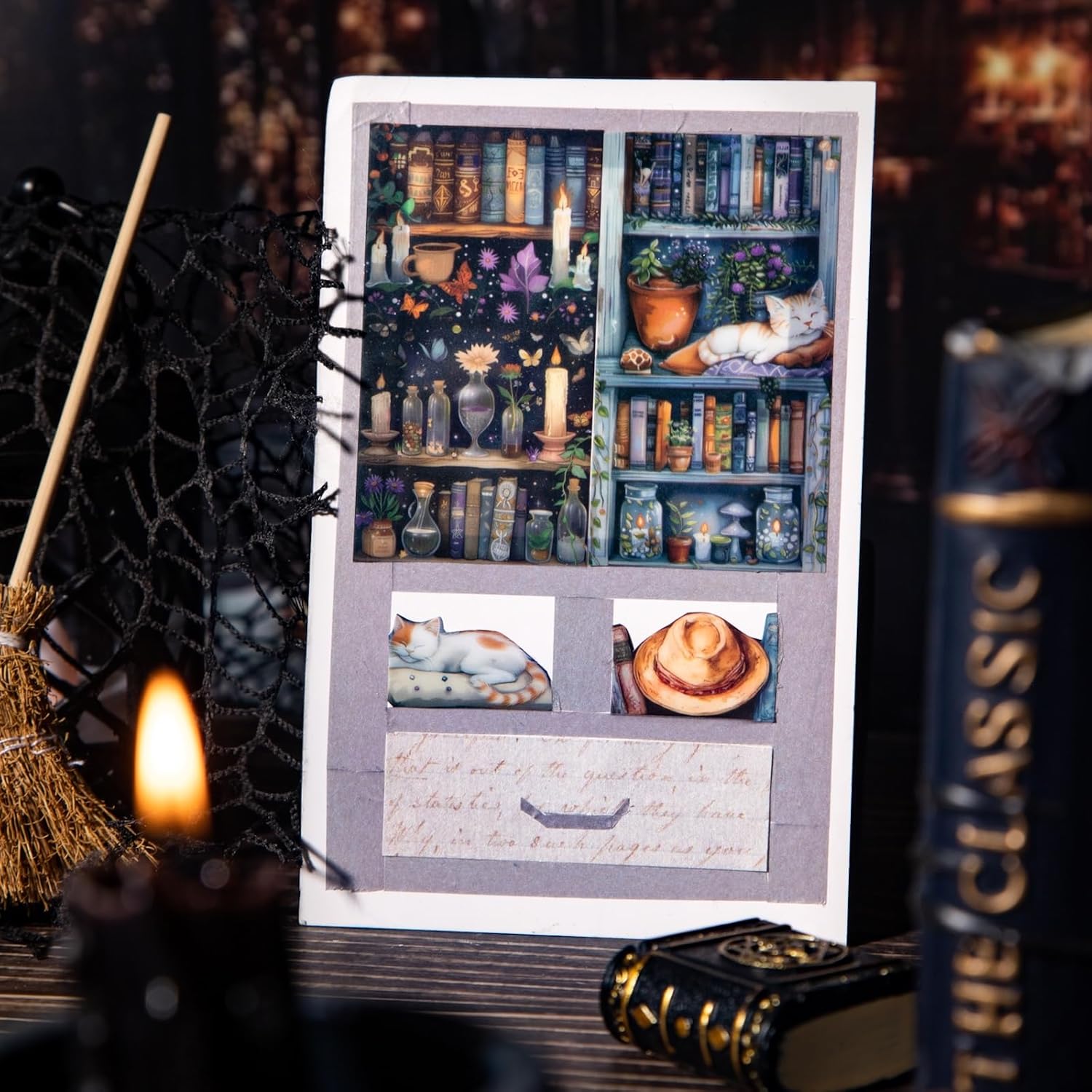 • Mystical Design and Size: This set includes 6 rolls of PET tape (1.57 inches wide × 78.74 inches long per loop), each adorned with dark magical bookshelf illustrations—featuring potion bottles, cats, books, and candles. The cohesive design style adds an enchanting, gothic atmosphere to any journal, scrapbook, or creative layout