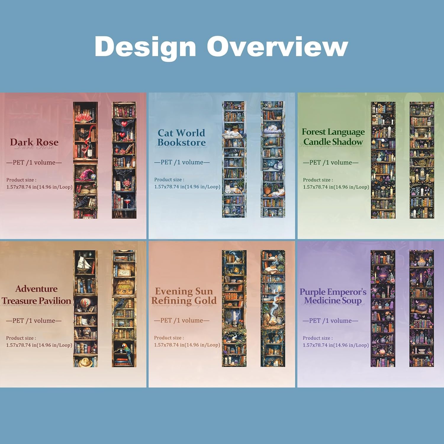 6 Rolls Dark Magic Bookcase PET Tape Set with Clip, Waterproof Gothic Scrapbook Sticker Rolls for Journaling, Bullet Diary, and Ephemera Craft Supplies