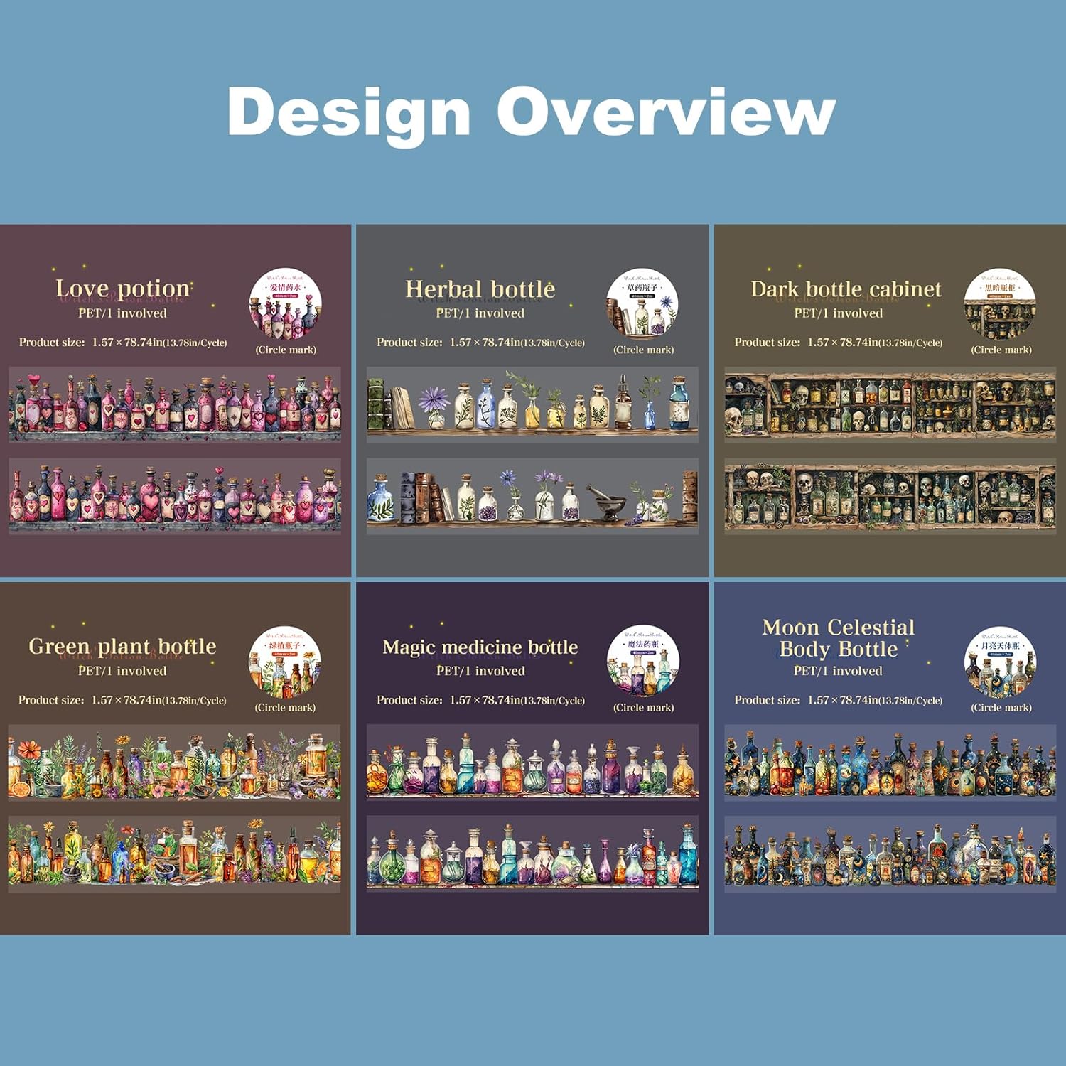 • Whimsical Potion Designs: 6 rolls of fantasy-themed PET tapes, each measuring 1.57in x 78.74in, showcase mystical potion bottles with floral, celestial, and gothic cabinet styles, adding enchantment and charm to any paper project