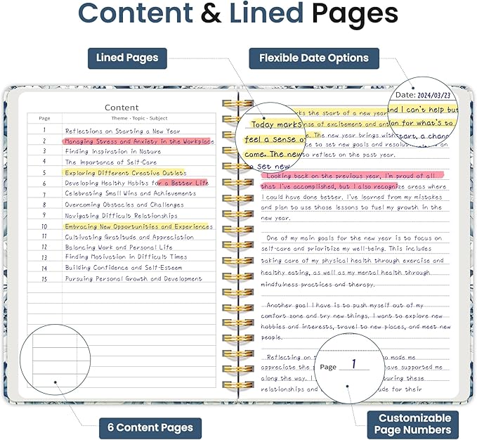 • Structured College-Ruled Pages: Featuring 7mm college-ruled lines, this journal notebook helps keep your writing organized and legible. The evenly spaced lines are perfect for structured notes, work lists, or detailed writing, making it an excellent choice for school students, professionals, and writers alike. It also includes 6 content pages, perfect for creating an index for easy reference.