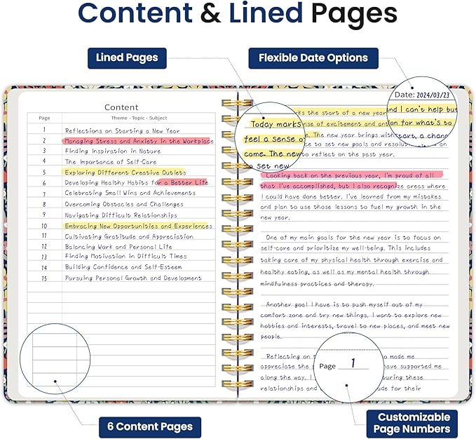 • Structured College-Ruled Pages: Featuring 7mm college-ruled lines, this journal notebook helps keep your writing organized and legible. The evenly spaced lines are perfect for structured notes, work lists, or detailed writing, making it an excellent choice for school students, professionals, and writers alike. It also includes 6 content pages, perfect for creating an index for easy reference.