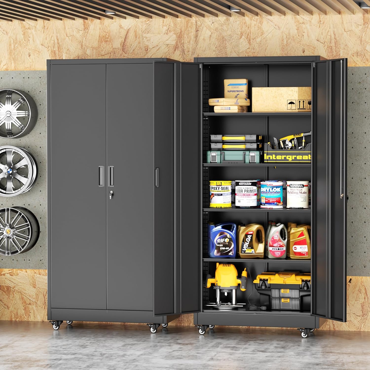 • ✅【EASY TO MOVE】Our garage storage cabinet has four lockable wheels that can be rotated 360 degrees, You can easily move it anywhere you want without worrying about being out of control. (adjust up to move, adjust down to lock)