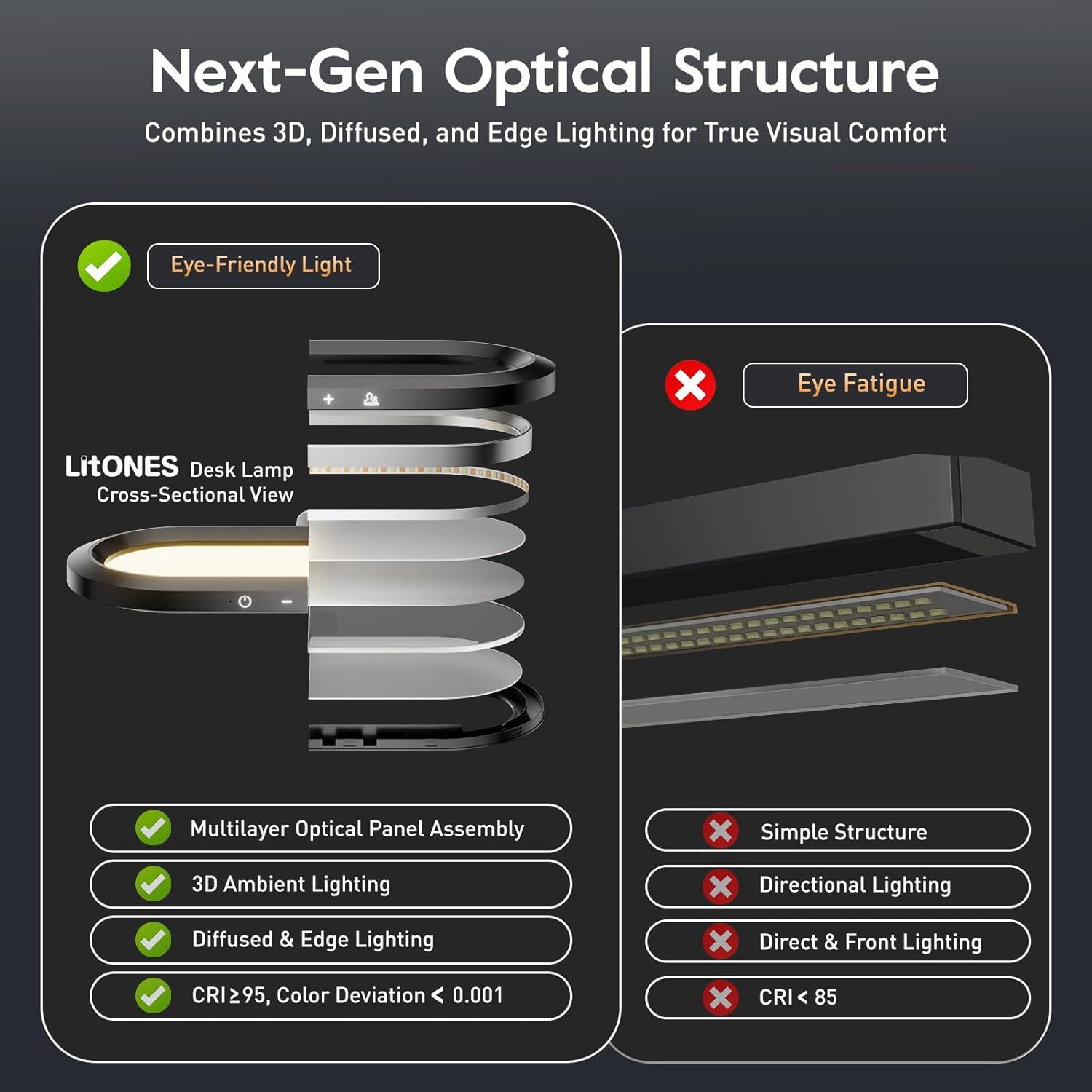 • Soft, Eye-Friendly 3D Ambient Lighting – All-Day Comfort, Less Eye Strain: LitONES desk lamp features a unique combination of 3D ambient light, diffused light, and side-emitting design to provide soft, even, three-dimensional lighting. This reduces harsh brightness contrasts in your workspace, minimizing frequent pupil adjustments that can lead to eye strain and fatigue. It creates a more comfortable lighting environment, ideal for long hours of computer work, video conferencing, and home office use.