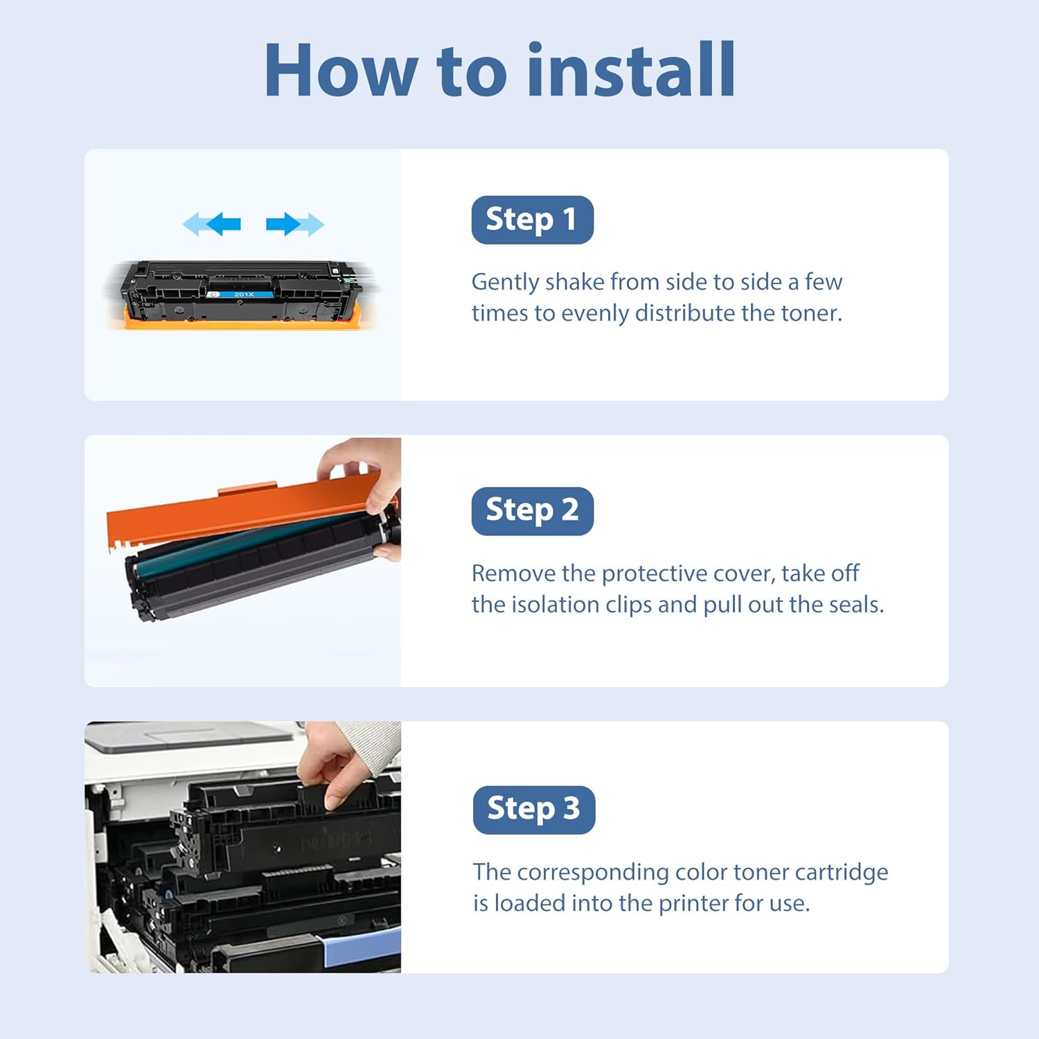 • Easy to install your new replacement for hp 201X toner cartridge, just follow the instructions and get up and running in minutes. Tip: Avoid touching the green drum, as oil stains on your fingers may affect the print quality.