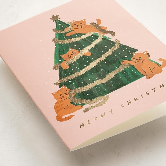 • FOLDED CARD DESIGN WITH REAL HAND-PRESSED FOIL DETAILING Each folded card features an illustrated Christmas tree playfully wrapped in garland and adorned with five mischievous orange tabby cats. The greeting “Meowy Christmas” is stamped in real hand-pressed gold foil on the front for a shimmering, festive finish. It’s the perfect combination of cute and classy for any cat enthusiast.