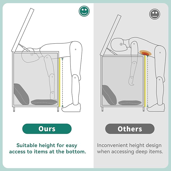 • Unique Design- The lower front panel is ergonomically designed so that even the innermost items are easy to reach; Easy lift and soft close mechanism enables the top to gradually open and shut with minimal effort, great for prevents smashed fingers; High leg design keeps the interior storage completely dry.