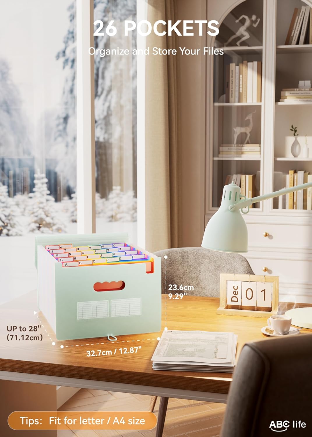 • 【26 Expanding File Folder】ABC life pockets accordian file organizer suitable for filing tax and storing important family documents. Product size is 13 "x 9.4"x 28", top and bottom are both expandable, For letter/A4 size files.