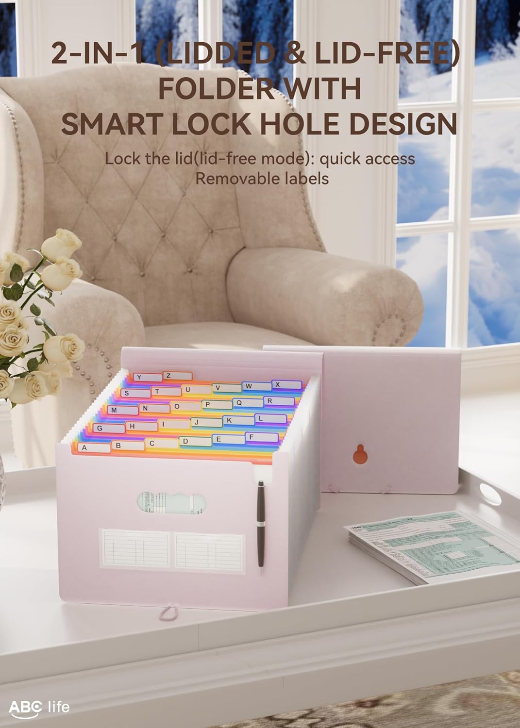 ABC life 26 Pockets Accordian File Organizer Expanding File Folders, Portable Letter A4 Size Filing Box,Plastic Monthly Receipt Document Organizer with Colored Tabs (Pinkish Purple)