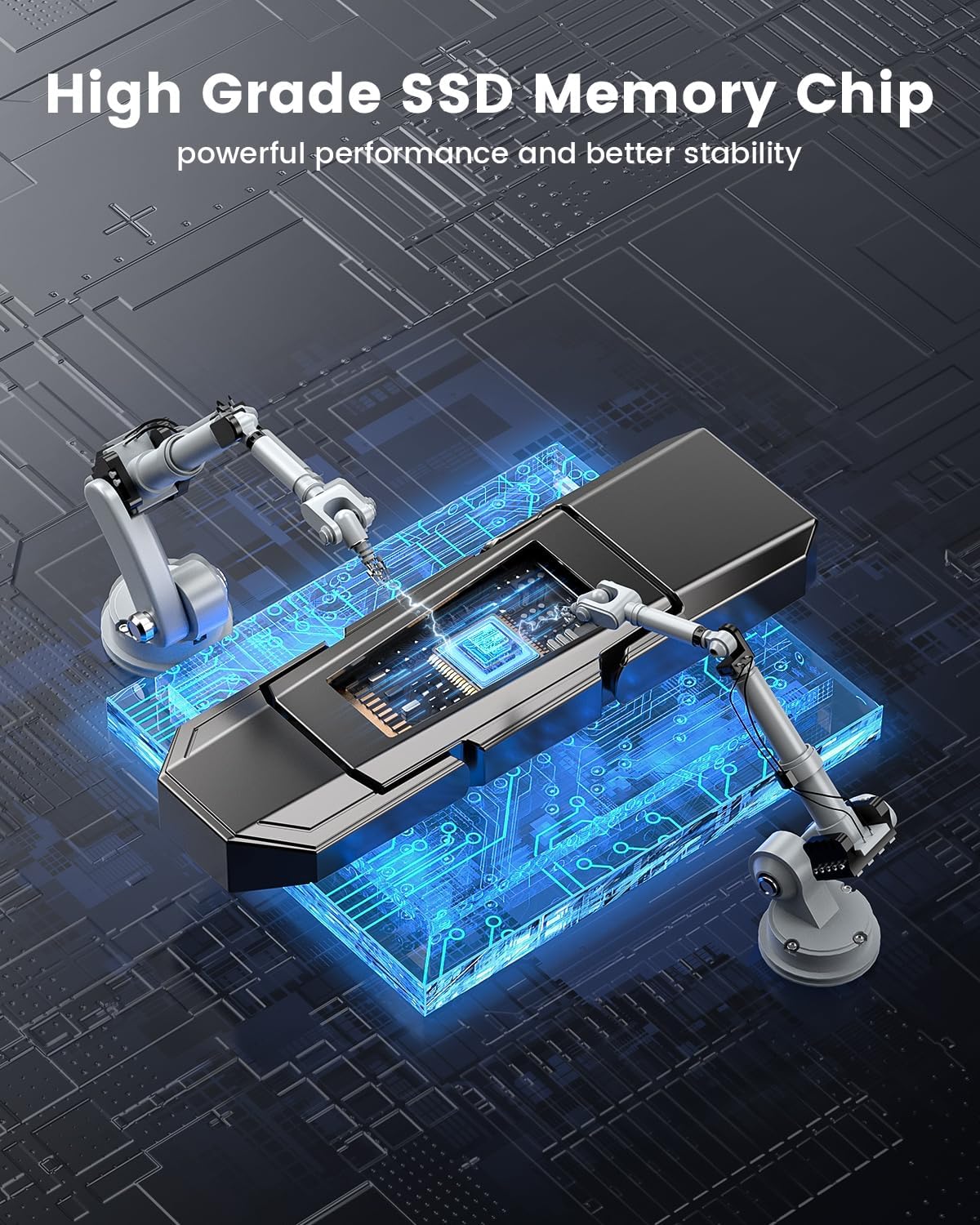 • Durable and Reliable: Adopting high-grade tlc memory particles combined with sturdy zinc alloy casing, the external ssd drive is drop-proof. The double-head cover design can better protect the interfaces from damage and well safeguard your important data.