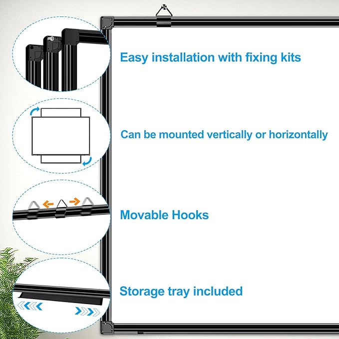 • ✔ Flexible installation – You can hang the magnetic whiteboard directly on the wall or install it hole-free with the complimentary removable hooks. There are two removable hooks on the long and short sides of the whiteboard, which can adjust the hanging distance according to your needs, allowing the white board to be hung vertically or horizontally.