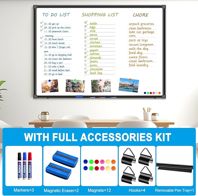 • ✔ Premium Durability – Unlike flimsy cardboard-core whiteboards, our sturdy wooden core resists warping, dents, and creases for long-lasting use. Black aluminum frame with ABS corner guards prevents dings.