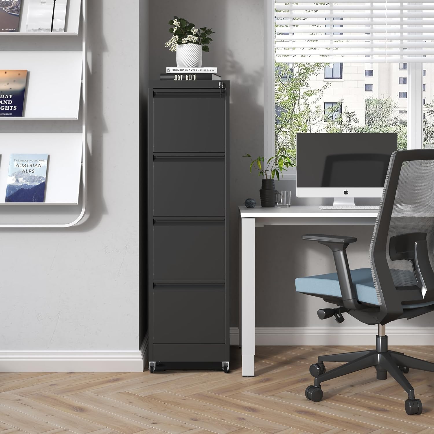 • 【User-Friendly Design】 The 4 drawer mobile filing cabinet equipped with 2 keys, when you leave the office, you can lock 4 drawers at once, to ensure your privacy and file security. And it built-in slide rail, drawer open and close smoothly, quiet, suitable for use in the office environment. The wheels can rotate 360° for easy movement.
