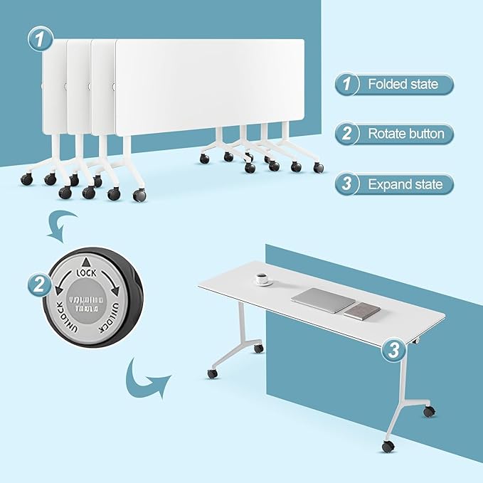 • ✅【ONE-CLICK FOLDING CONFERENCE TABLE】 Group room tables are an excellent choice for conference rooms, reception rooms and training rooms. Just turn the knob and the table can be easily flipped, saving a lot of space and making it easy to store and carry.
