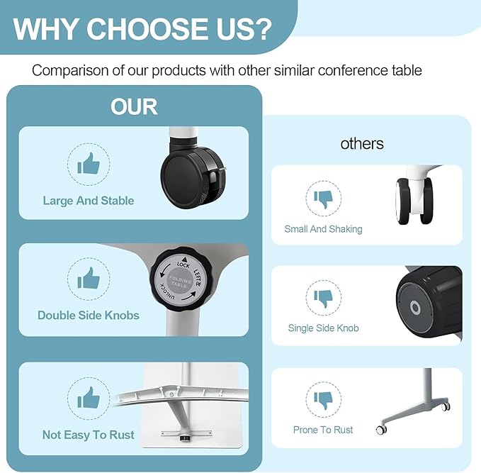 • ✅【360° MOVEMENT】The conference room table is equipped with 4 silent universal wheels. The casters can quickly move 360° to any corner, making it flexible and convenient, saving effort and worry. Conference tables can be arbitrarily combined according to different conference grouping needs.
