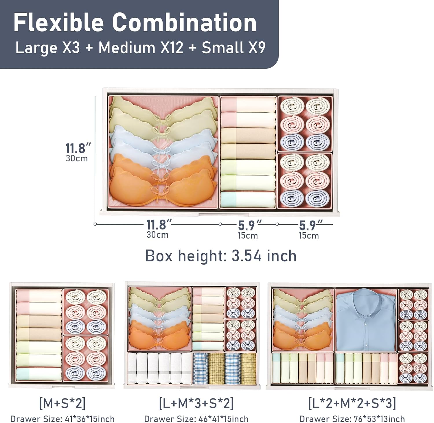 • Free Combination: This drawer organizer clothes set includes 3 large square boxes (11.8"x11.8"x3.54"), 11 medium containers (11.8"x5.9"x3.54") and 6 small bins (5.9"x5.9"x3.54"). A variety of sizes can be flexibly combined to meet different storage needs. The small drawer organizer can be freely configured in wardrobes and other spaces to achieve efficient and personalized classification and organization
