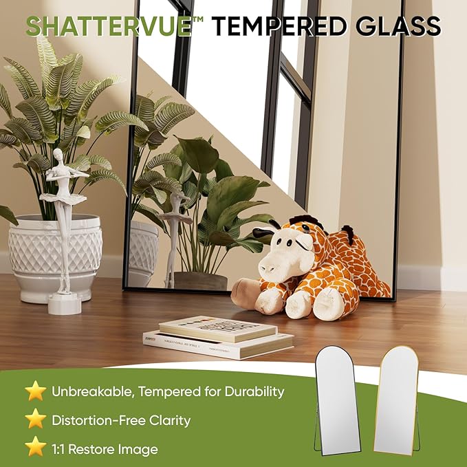 • Shatter-Resistant Glass - Our full length mirror engineered with a weighted, stable base to prevent tipping, ideal for homes with kids or pets. What sets it apart is the special explosion-proof material used, which ensures that even if accidentally damaged, the glass will not scatter all over the floor