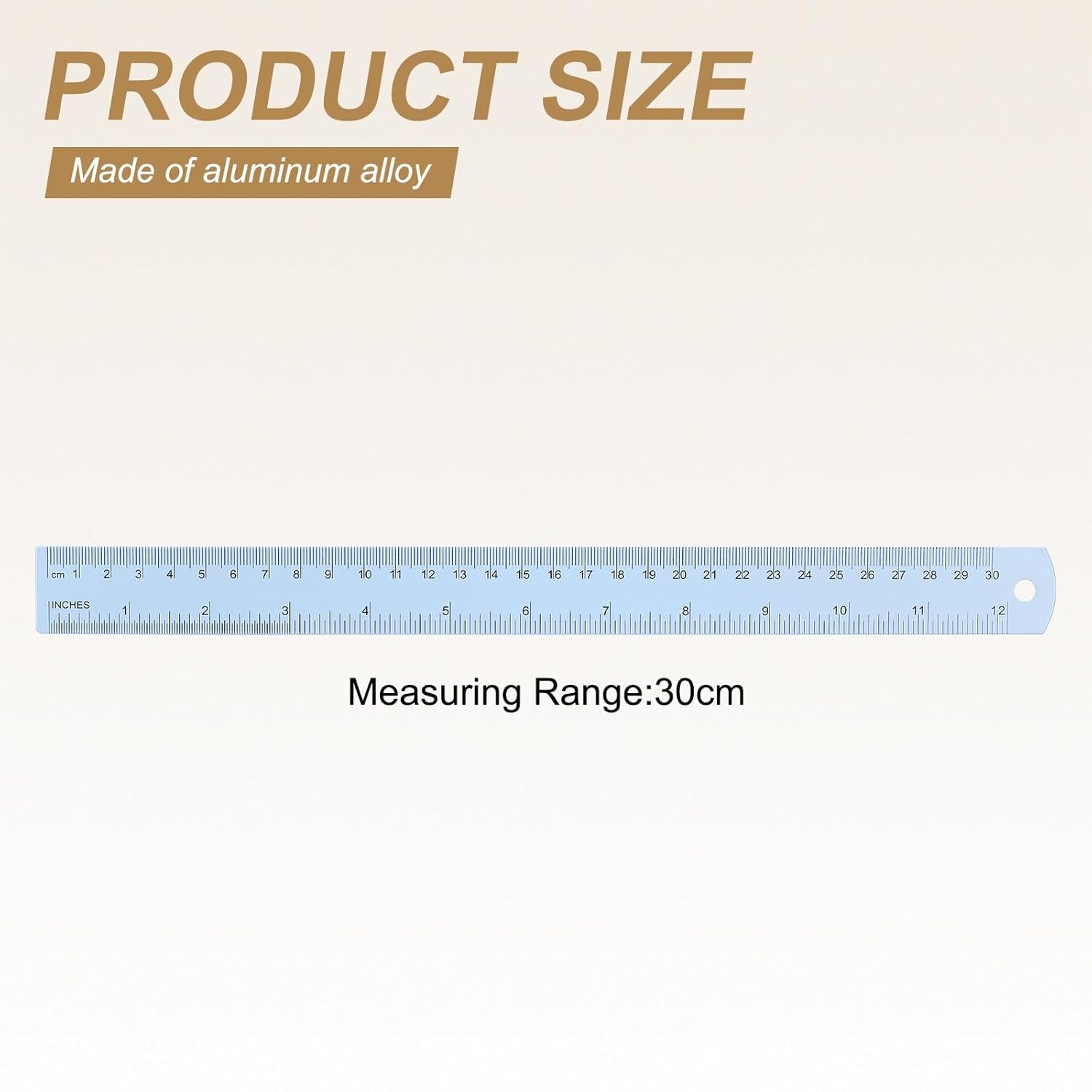 HARFINGTON 4pcs Metal Straight Ruler 30cm Metric SAE Aluminum Alloy Measuring Rulers Scale Tool with Hole for Measure Study Reading Classroom Office, Light Blue