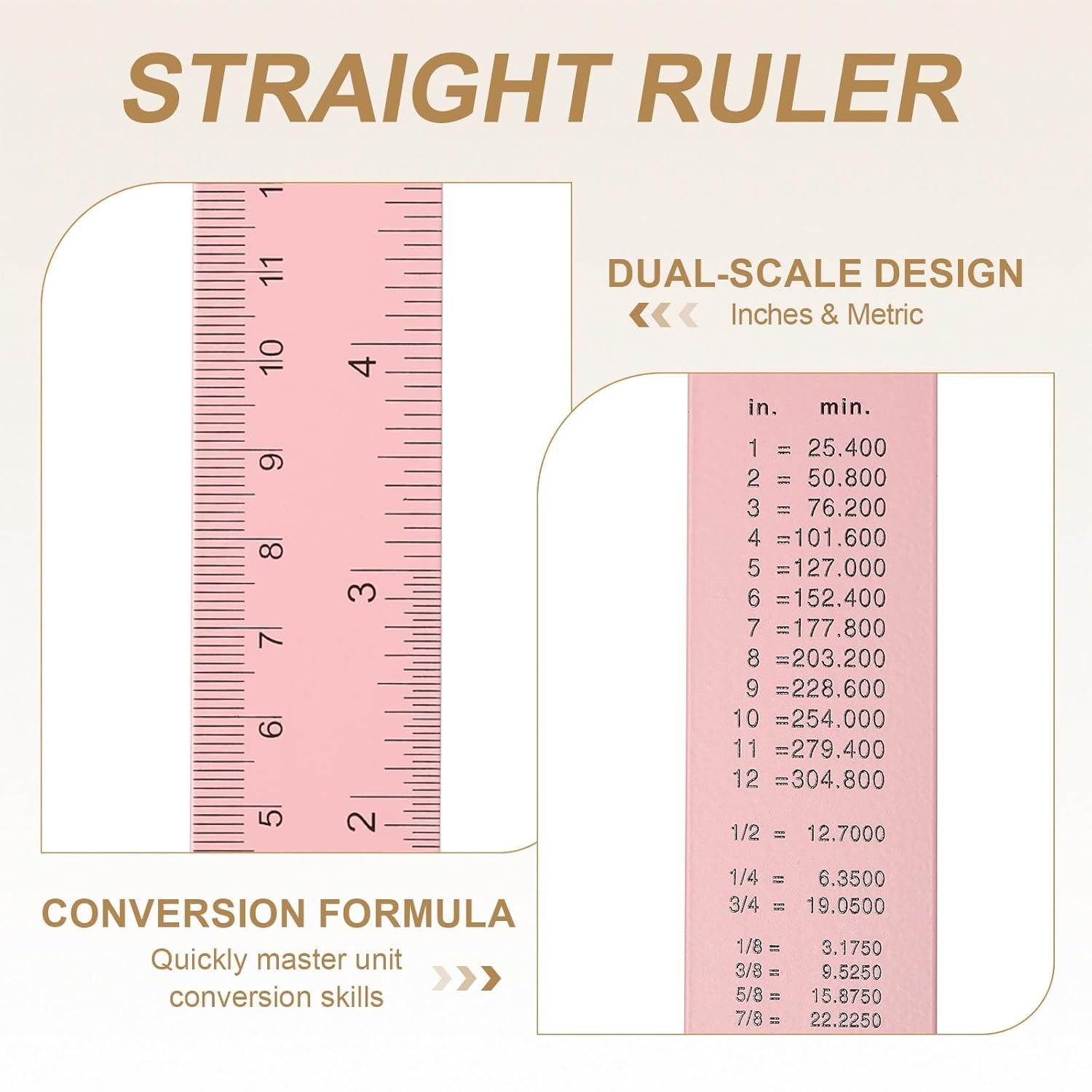 • Feature - The ruler features ink printing technology on its surface, ensuring that the scale is clear and sharp, remaining non-fading and non-blurring even after long-term use. It has a dual-scale design, and the back is carefully printed with a complete set of conversion formula for metric and SAE units, allowing beginners to quickly master unit conversion skills. Additionally, it includes a hanging hole design for convenient storage and accessibility.