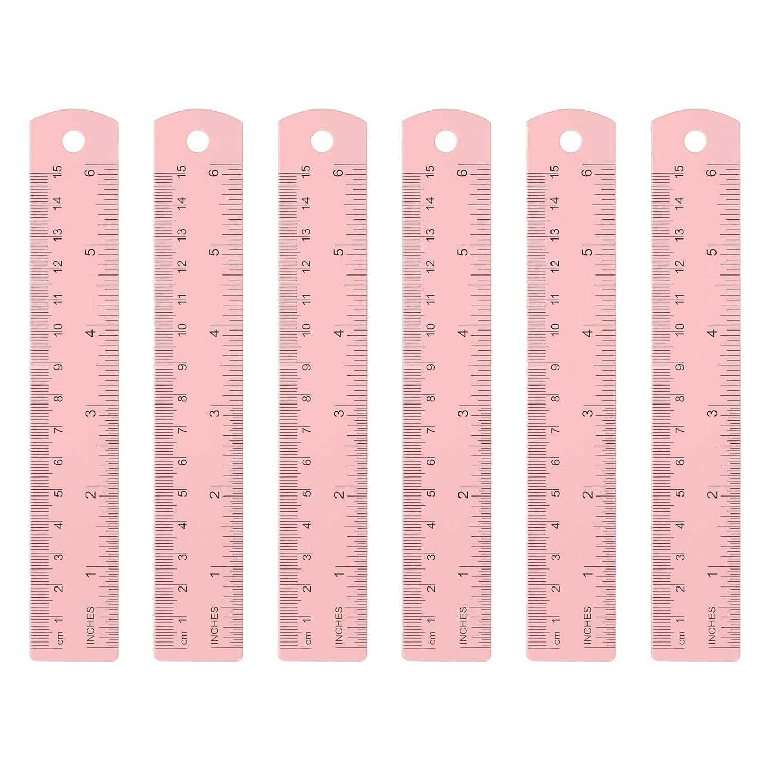 HARFINGTON 6pcs Metal Straight Ruler 15cm Metric SAE Aluminum Alloy Measuring Rulers Scale Tool with Hole for Measure Study Reading Classroom Office, Pink