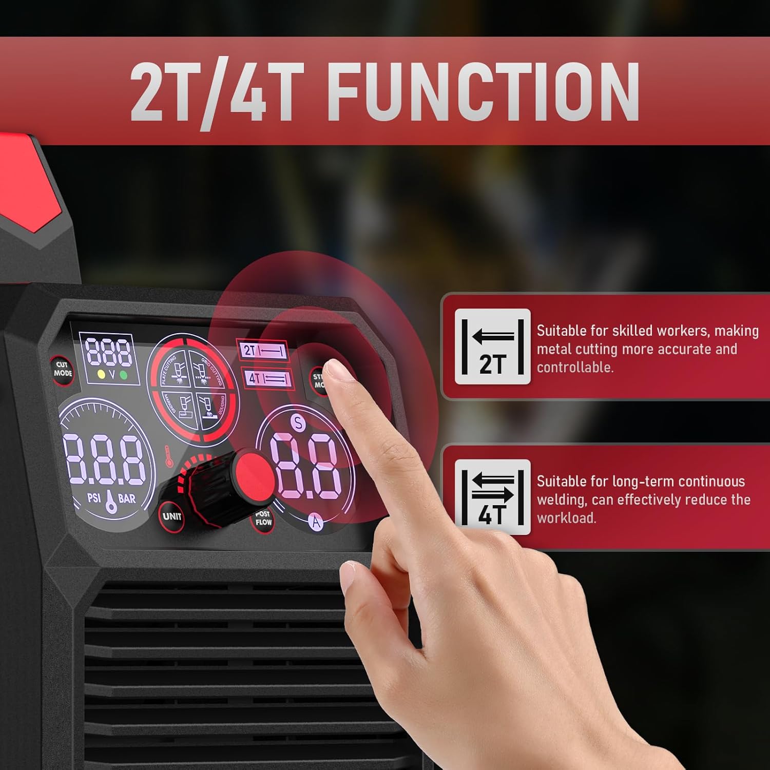 • DIGITAL DISPLAY: The latest digital display centrally shows parameters such as air pressure, voltage, current, etc., allowing users to view the status of the equipment in real time, adjusting the operation in a timely manner, and improving the efficiency of the operation. There will be an error code system on the screen if there is a problem with the machine.