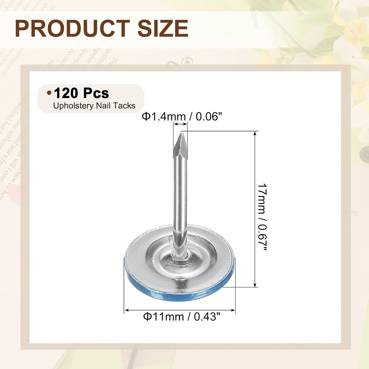 • [Size & Quantity] - The package comes with 120pcs decorative upholstery tacks. Sufficient quantity to meet your different daily needs. The overall size of upholstery nails is about 11mm x 17mm/0.43-inch x 0.67-inch(D*H)