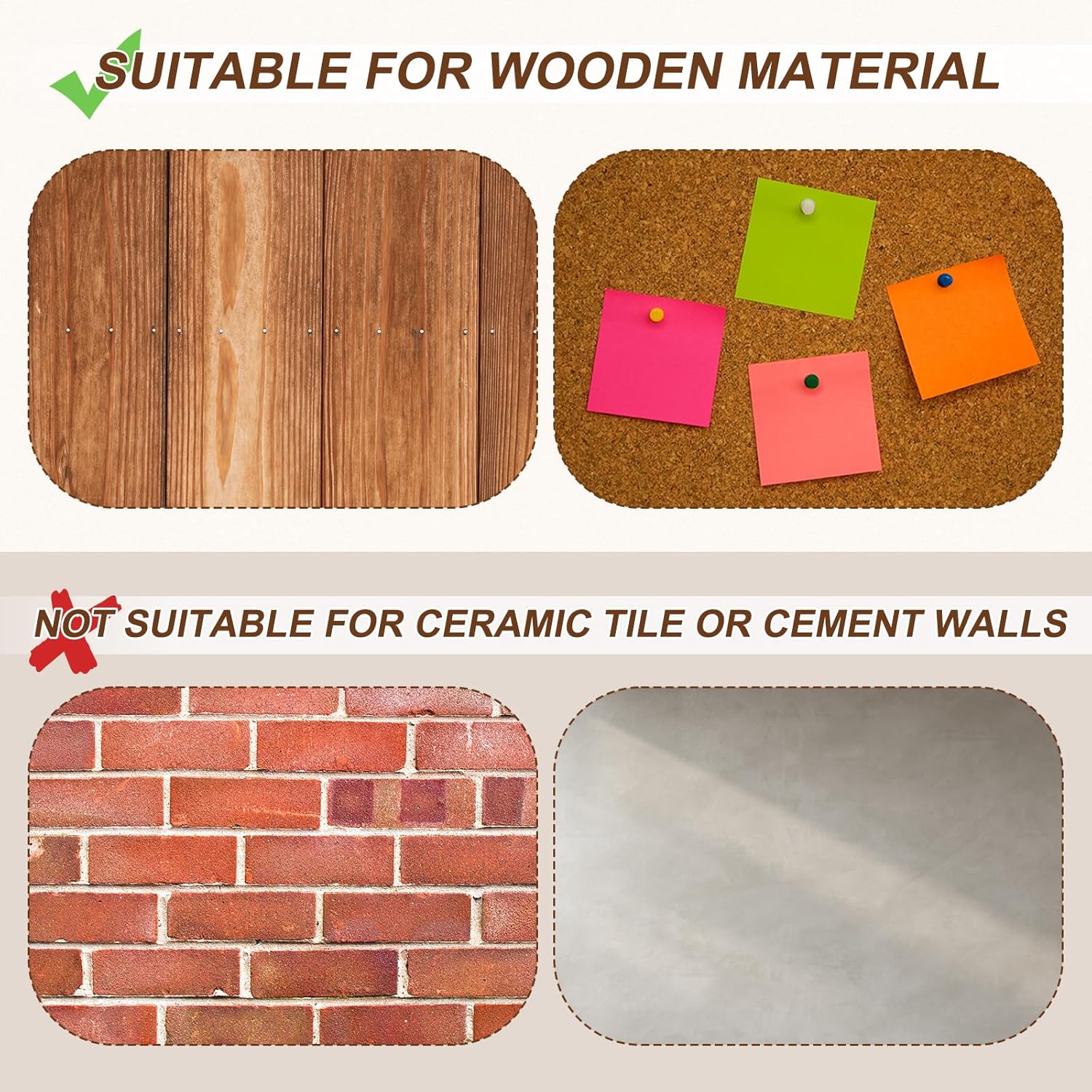 • [Easy to Use] - These upholstery tacks are designed to be easy to insert and remove, makes them great choice for quick replacement and adjustment. You can clamp the pins with pliers and install them with a rubber nail hammer, or press them directly into the cork board with your hands. After testing, the nails can only be nailed into the lime layer on the surface, so the nails are not suitable for hard walls such as tiles and cement walls