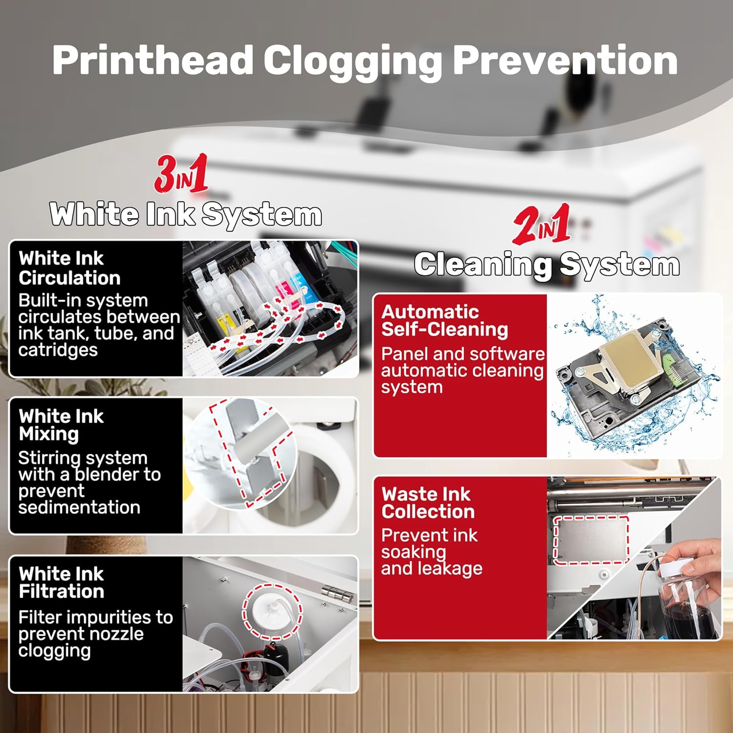 • ✅[Printhead Protection System] 3-in-1 white ink circulation, mixing, and filtering with CISS (Continuous Ink Supply System) to prevent the printhead from being clogged by white ink. The moisturizing device ensures that even if the printer is not used for a long time, the inside of the printhead can still remain moist to prevent clogging.