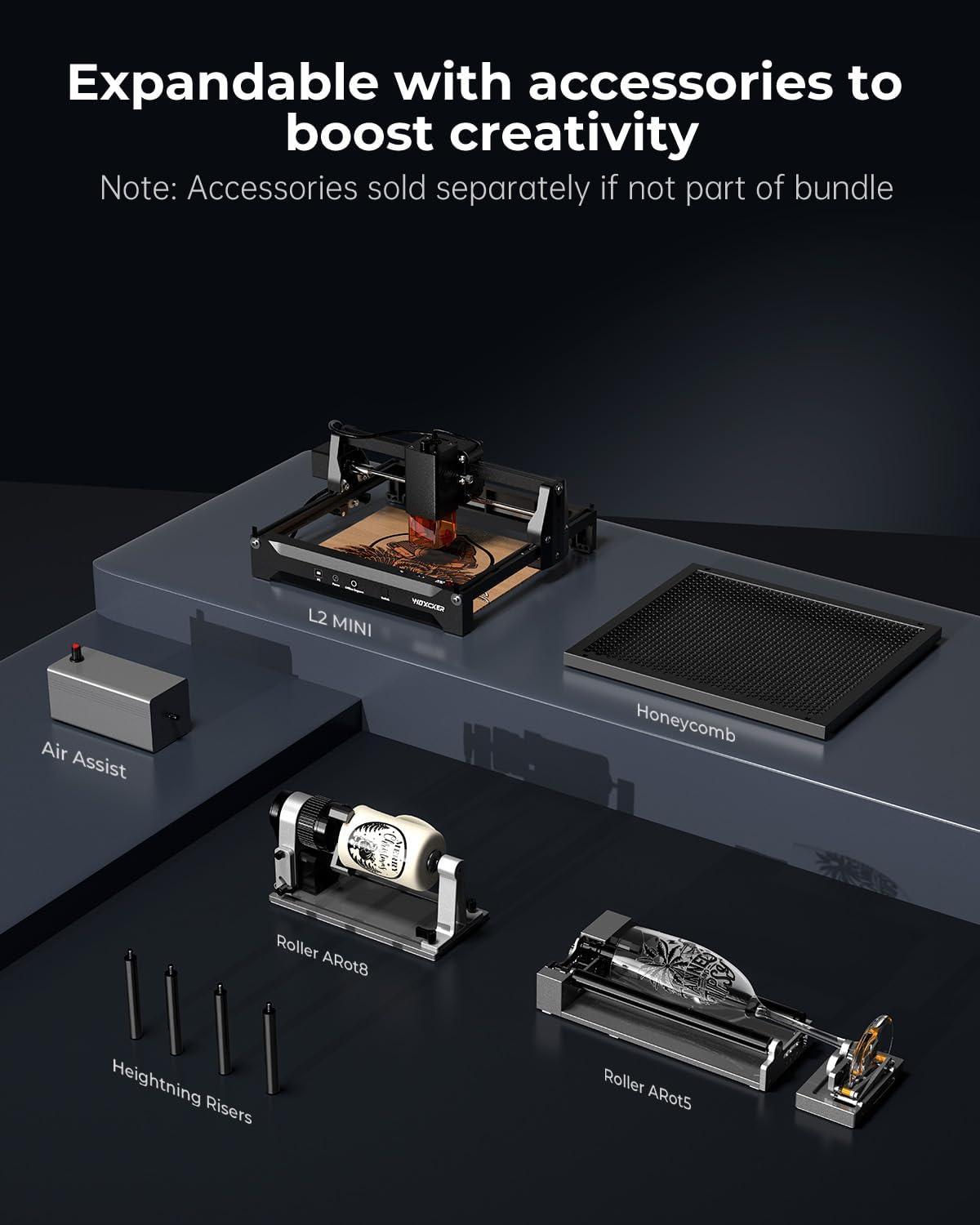 • Modular System – Expand Your Way: The true power of L2 Mini/Flex lies in its highly expandable modular system: Supports 1064nm 1W / 5W / 10W laser heads for engraving and cutting at different power levels. Compatible with rotary modules (up to 100mm diameter) for tumblers, mugs, and cylindrical objects. Add riser bases and extension rails for taller or larger-format projects. Easily expand with air assist, air purifiers, honeycomb beds, protective covers, and more