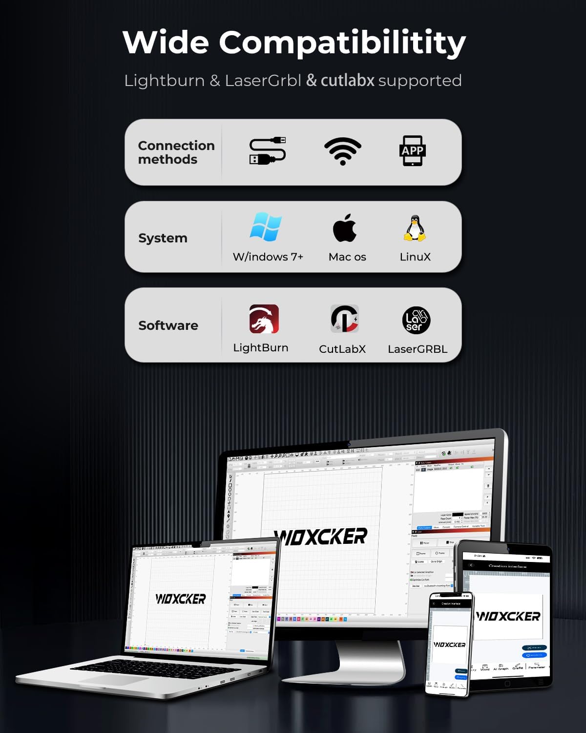 • Smart Software Compatibility: Works seamlessly with LightBurn, LaserGRBL, and CutLabX, supporting Windows, macOS, Android, and iOS systems. Accepts a variety of file formats, including JPG, PNG, BMP, SVG, DXF, and AI—ensuring creative flexibility.