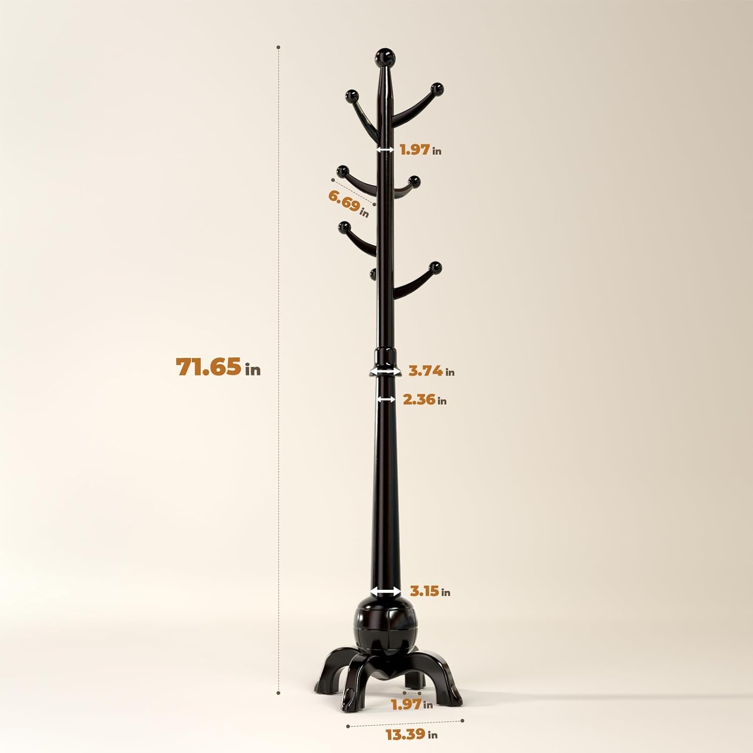 Wood Coat Rack Freestanding, Solid Wooden Hall Tree with 8 Hooks, Coat Tree Freestanding Heavy Duty with Stable Base, Entryway Hallway Bedroom Office Use, 240lbs Load Capacity H:71.6in (Black)